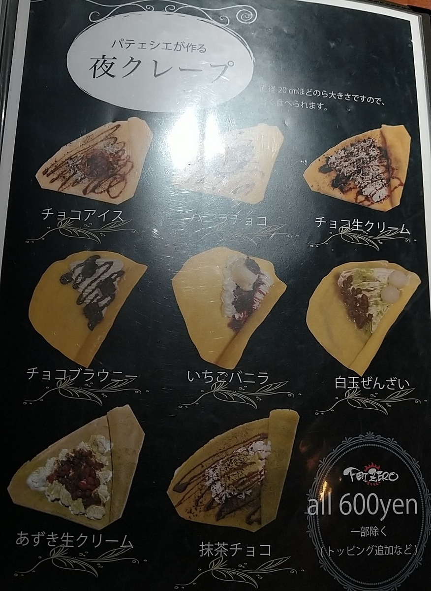 デザートはパフェとクレープの二種類。どちらも600円からでパフェは注文から作るため早めの注文を勧められています。