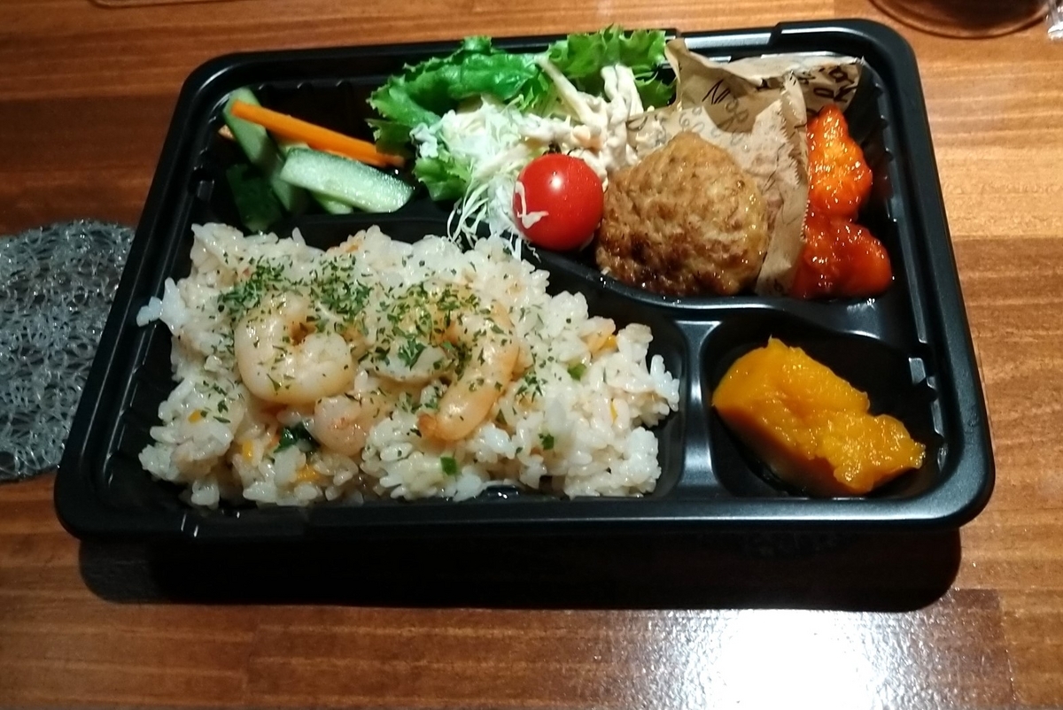 今回はエビピラフ弁当(700円)を注文。主菜が2種類、サラダに漬物、副菜が1種類となっています。この日の主菜はハンバーグと旨辛チキンでした。