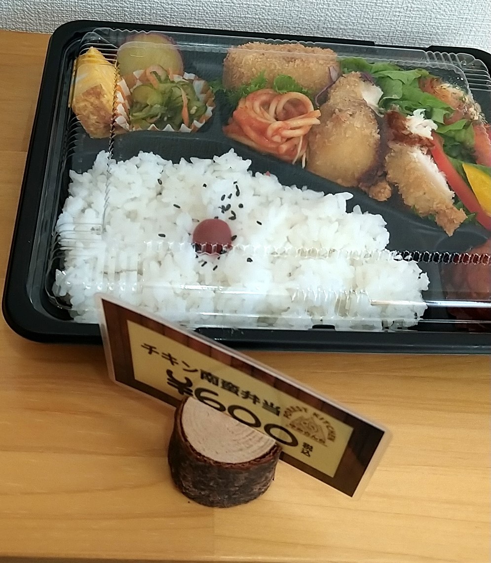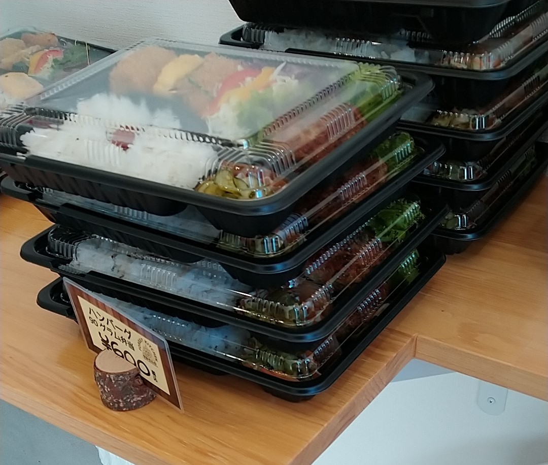 営業は今のところ月・水・金の3曜日。お弁当は90グラムのハンバーグと120グラムのハンバーグの2種類。この日はチキン南蛮やチキンカツといった肉系おかずの弁当がメインとなっており、120グラムハンバーグ以外は600円となっており、4〜5種類の弁当が置いてあります。
