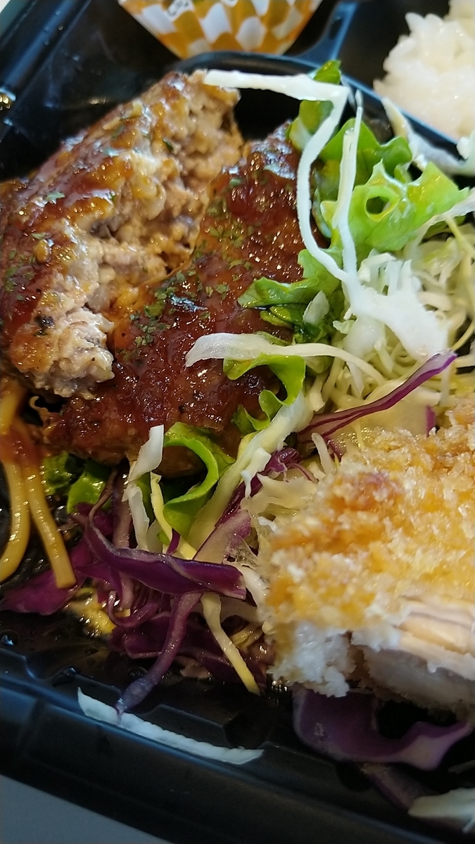 まずは主役のハンバーグから。味付けは塩コショウのきいた照り焼き味のおかず系です。粗挽きのゴツゴツ系で、ご飯が進む味付け。90グラムなのでこのハンバーグだけだと物足りないけど、コロッケやカツも一緒に入っているので十分な量。かつやコロッケはソースがかかっていませんが、濃いめに味付けしてあるのでソース不要でもおかずになります。