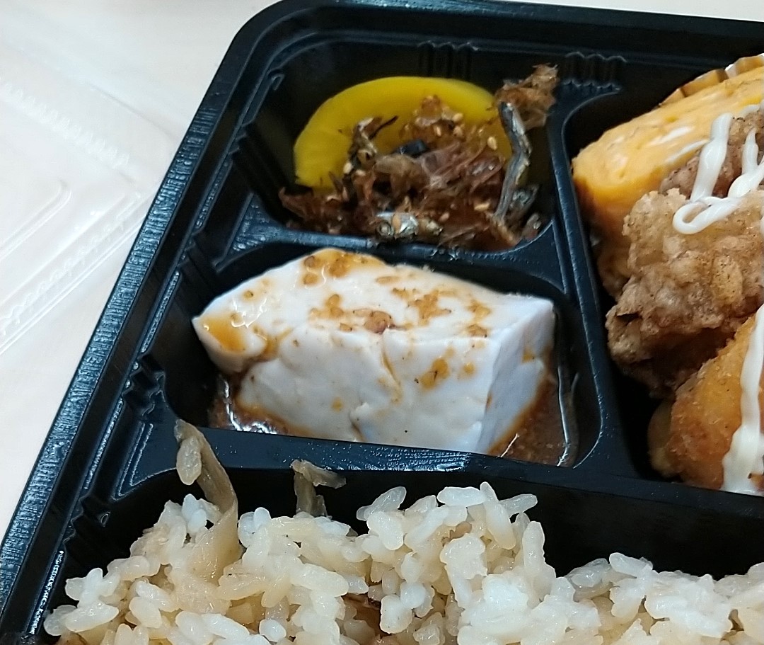 白ご飯、とりごはんどちらでも値段の変更はありません。他には唐揚げ・野菜天・コロッケ・エビフライ・卵焼き・揚げナス・ごま豆腐・漬物・サラダとなっています。