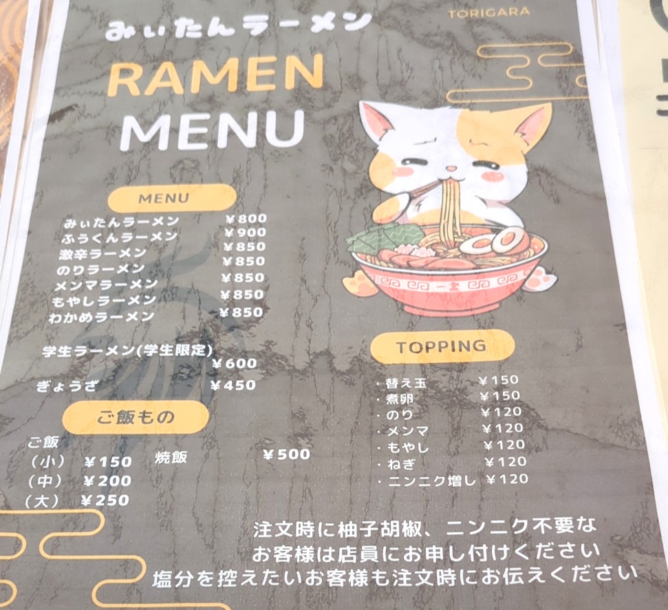 ラーメンの種類はメインのみぃたんラーメン。ふぅくんラーメンに激辛ラーメン、のりラーメン、メンマ・もやし・わかめラーメンに学生限定で600円の学生ラーメンとなっています。