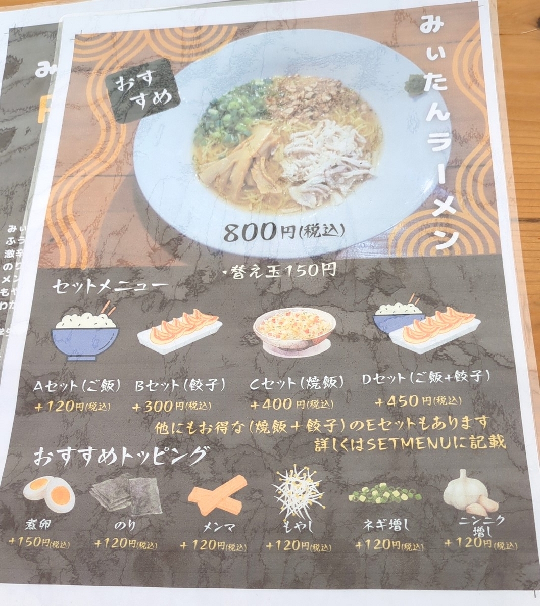 メニューはメインのみぃたんラーメンに加え、ご飯がつくAセット(120円)、餃子のBセット(300円)、炒飯のCセット(400円)、ご飯と餃子のDセットとなります。