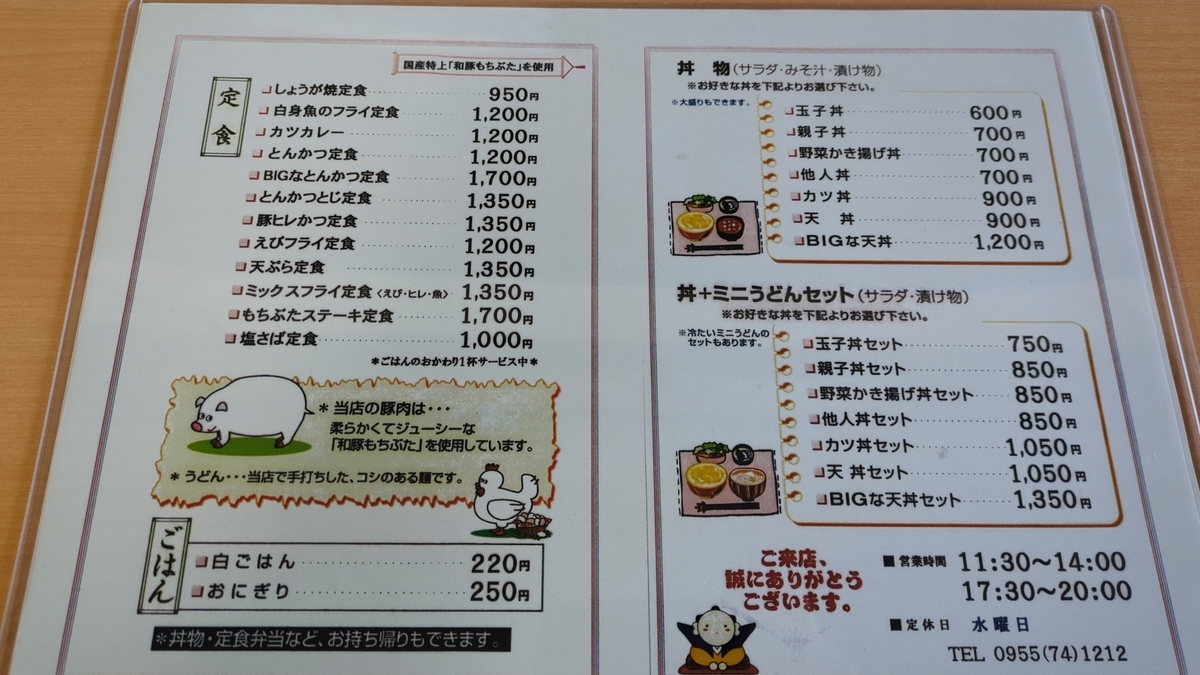 メニューは定食・うどん・丼の3種類。定食はブランド肉であるもち豚を使った肉系メニューが中心で、定食は生姜焼き、とんかつ、かつとじ、豚ヒレカツ、もち豚ステーキ定食といったもち豚を使った肉系定食や、白身魚フライ、塩サバ、エビフライ、天ぷら定食といったオーソドックスな定食メニューが1000~1500円で提唱されます。