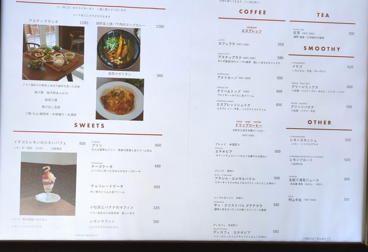 メニューは月替わりで内容が変わる、野菜を中心とした小鉢メニューが豊富なアステップランチ(1280円)や焼き野菜と豚バラのスープカレー(1200円)、ナポリタン(980円)が食事メニュー。