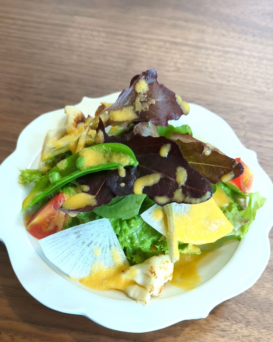 こちらは別添えで出されたフレッシュサラダ。上にはニンジン系のドレッシングがかかっています。農業法人のサラダということで、野菜は新鮮で種類も豊富。ミニトマト、スナップエンドウ、カリフラワー、リーフレタス、大根系など、様々な野菜がふんだんに盛り込まれていました。