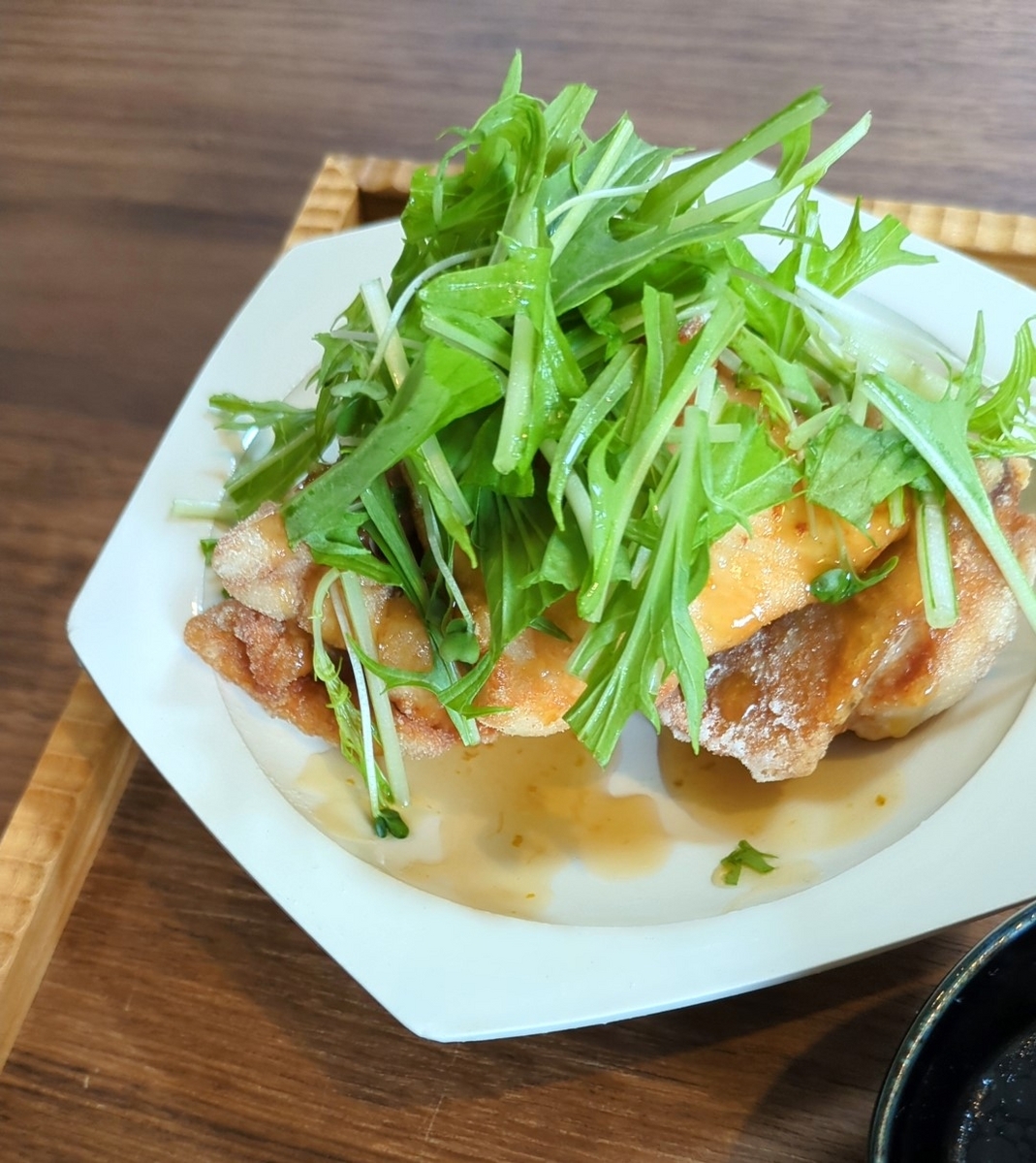 まずはメインの揚げ鶏。大きめの鶏もも肉が4つに水菜がたっぷり乗せてあります。味わいとしては柚子胡椒は風味を生かすあっさりとした味付けで、柚子胡椒ですが塩味は抑え気味。お酢のすっぱさもそこまで感じない優しい味付けです。