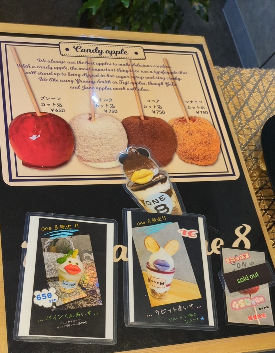 りんご飴はそのまま提供するスタイルと、食べやすいようカットしてカップに収めて持ち帰れる2種類で提供。種類もプレーン・ミルク・ココア・シナモンの4種類でプレーンが650,その他が700円となっています。