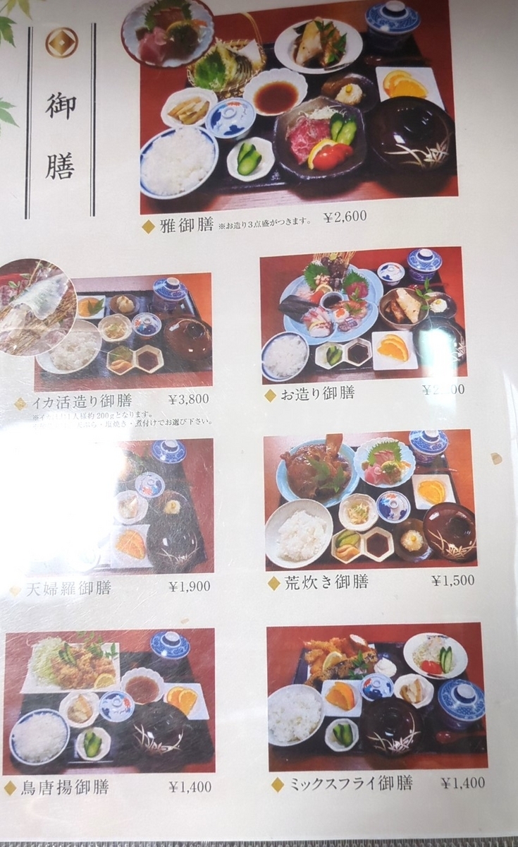 鏡で居酒屋をしている要の系列店となっており、メニューは海鮮系をメインとした和食が中心。ランチではミックスフライ御膳、唐揚げ御膳(1400円)やあら炊き御前(1500円)、天ぷら御前(1900円)、さらに刺身系のお造り御前(2200円)とイカ活け造り御膳(3800円)に、天ぷら、刺身、あら炊きが楽しめる雅御膳(2600円)があります。