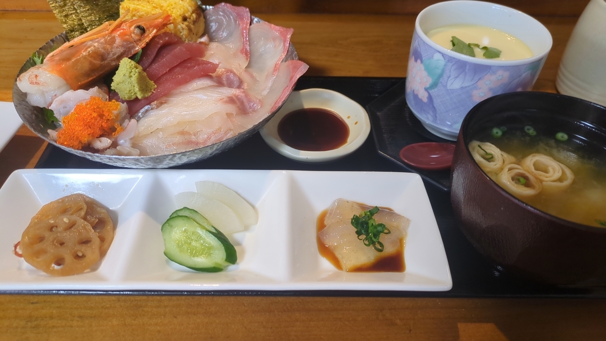海鮮丼以外では味噌汁、茶碗蒸し、副菜3種とデザートがセットです。以前食べたときは茶碗蒸しがいまいちでしたが、今回はちゃんと出汁の風味が効いた茶碗蒸しになってました。