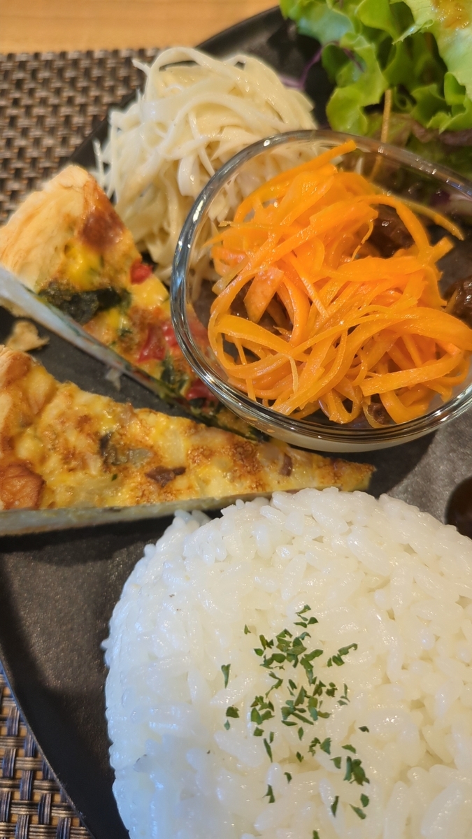 まずは週替わりで不動のキッシュから。玉ねぎとキノコ、パプリカとほうれん草の2種類となっています。しっかりと火を通した卵は固めでしっかり味です。おかずとしても十分。