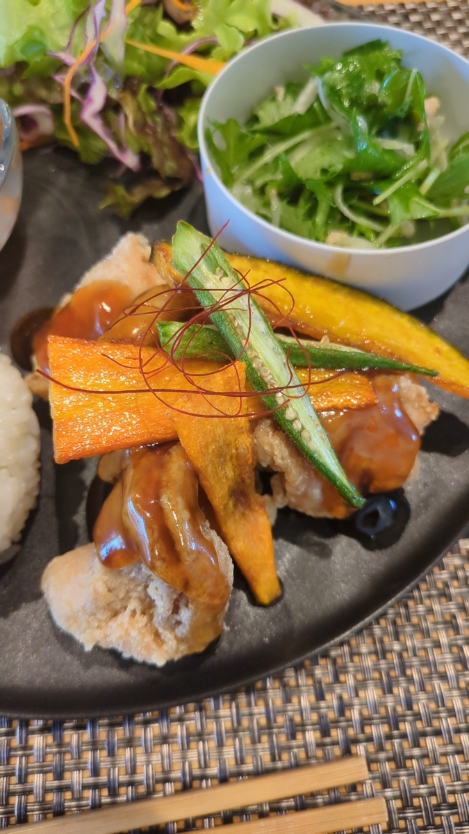 主菜の唐揚げの甘酢あんかけ。唐揚げが3つでこちらは濃いめの味付け。ですがこちらにも揚げ野菜がトッピングされており、罪悪感が薄まる。
