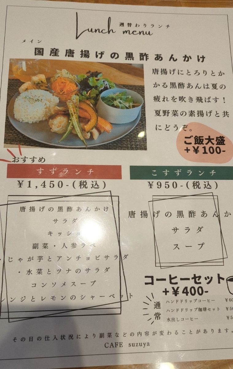 メインメニューは週替わりのすずやランチ(1450円)。ランチプレート+スープ+デザートの組み合わせで、主菜1つ・キッシュ1~2種・野菜サラダ・3種の副菜が一つのランチプレートにのっています。週替わりの内容はインスタグラムで公開されています。野菜メニューが中心なので、野菜不足に悩む方におすすめです。+400円でコーヒーをつけることが可能です。
