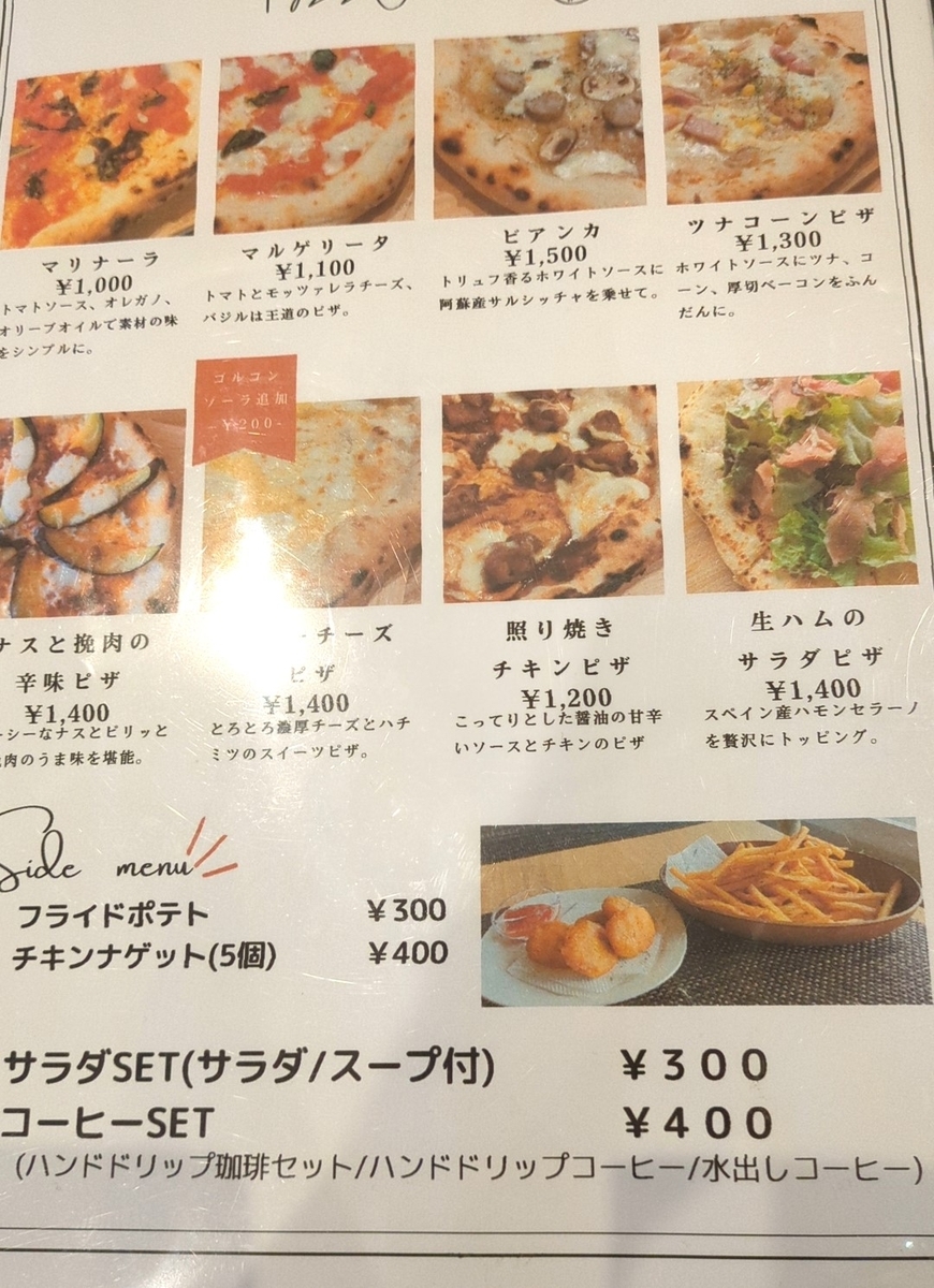 またピザメニューも豊富。チーズ嫌いな人向けにチーズを使わないトマトピザのマリナーラから、マルゲリータ、。照り焼きチキン、サラダピザ、ツナコーンといったオーソドックスから野菜系など様々取り揃えています。+300円でサラダ・スープがつき、さらに400円でコーヒーがつきます。