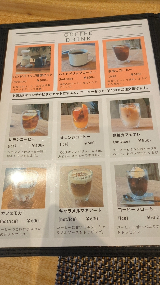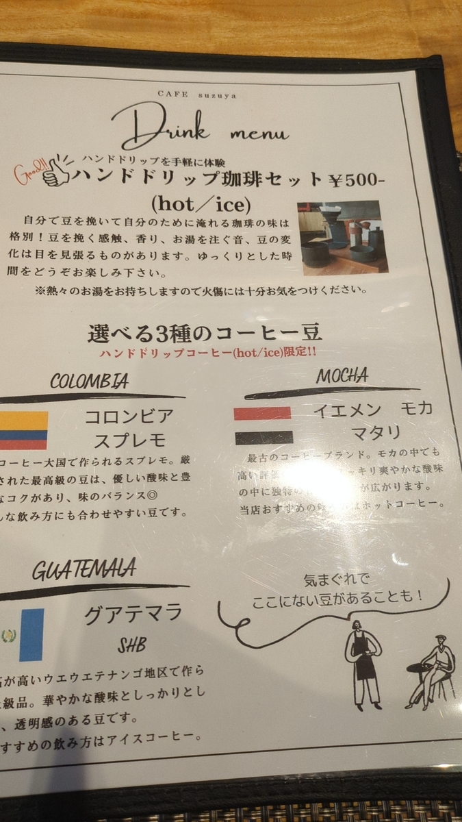 こちらはコーヒーにもこだわりがあり、3種類の豆を選べるハンドドリップコーヒーは自分でもドリップが可能。もちろんコーヒー以外のオリジナルドリンクも豊富です。