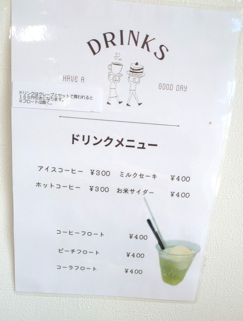 ドリンクメニューはクレープと同時注文で100円引きとなります。