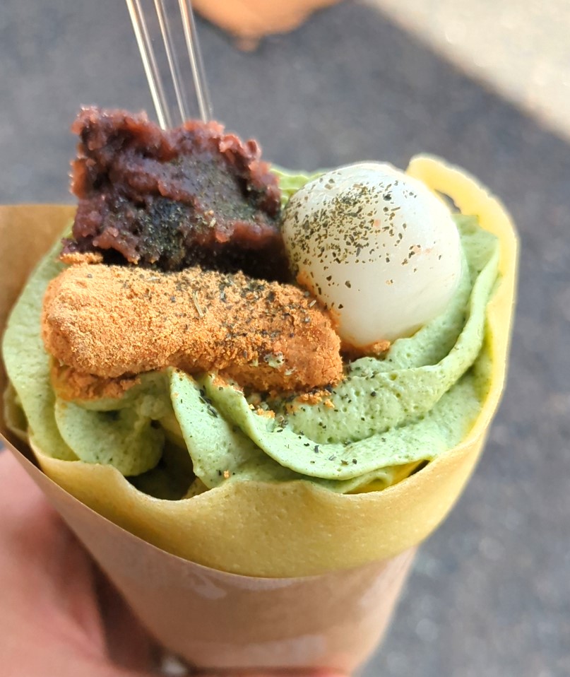 ただこちらのクレープ。最後辺りにわらびもちが隠れていますが、そのわらびもちは結構甘め。最後辺りは結構お腹に溜まっているため、そのタイミングでこられるときつかったです。