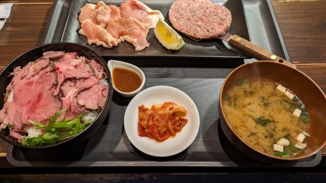 店内飲食 3月からランチを始めた個室焼肉店 上場亭和多田店のハンバーグとローストビーフ丼ランチ(880円)