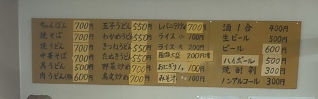 メニューはちゃんぽんや焼きそば、うどん、中華そばといった麺類メニューが中心。さらに野菜炒め、鳥皮炒め、レバニラ炒めといった炒め系おかずが揃います。