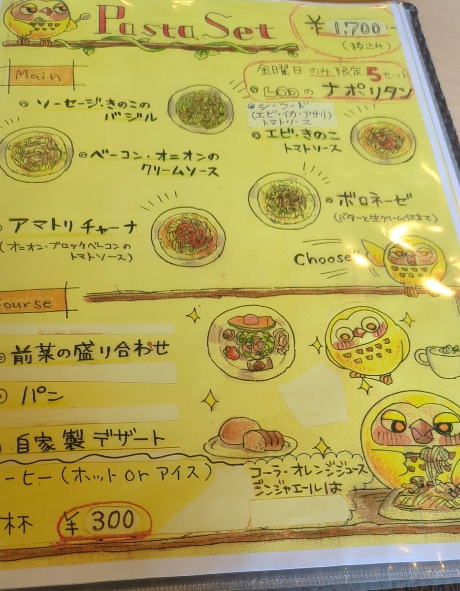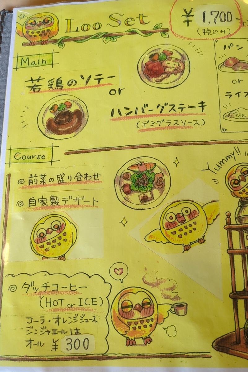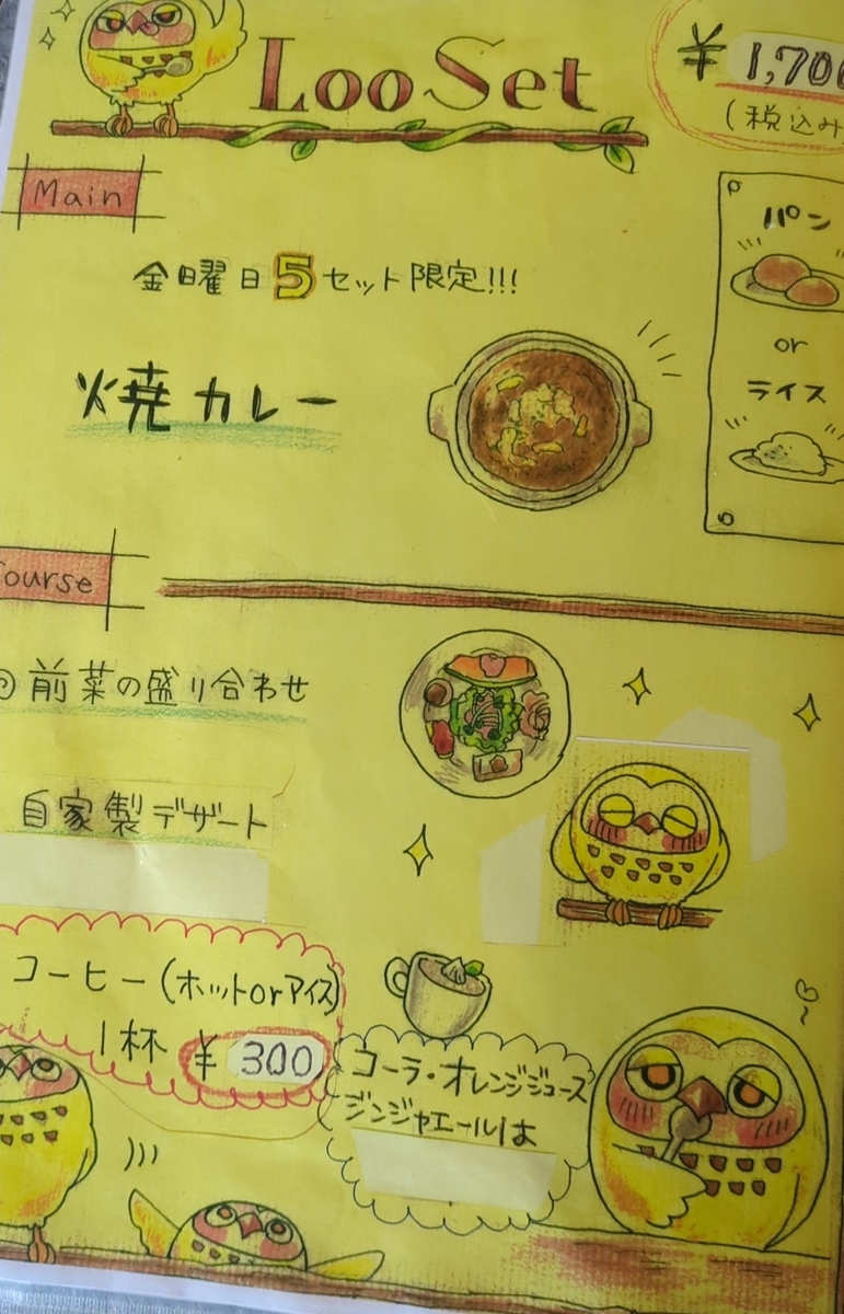 メニューは1700円のセットメニューが中心。前菜・デザートは共通で6種類のパスタを選べるパスタセット。ハンバーグもしくは鶏のソテーがメイン(金曜は5食限定で焼きカレーもあり)のLooセット。パスタセットはパン、Looセットはパンorライスが選べます。
