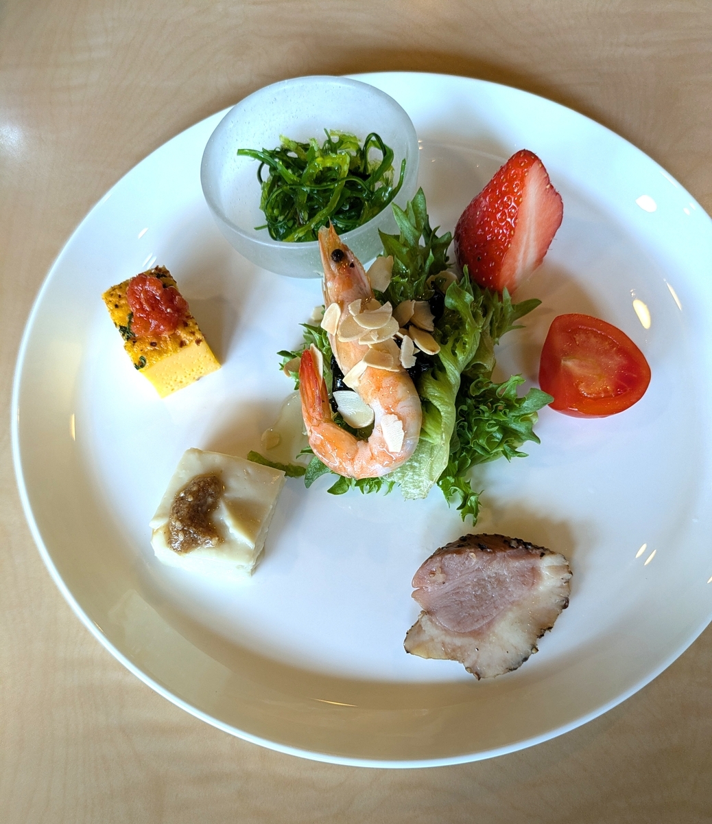 まずは前菜。鴨のローストにごま豆腐。キッシュ?。海藻サラダ。いちご、野菜サラダ。エビ(味付け有)のセット。この中ではまさかのサラダがおいしかった。特に海藻サラダがおいしかったな・・・ゴマ豆腐はなんでイタリアンなのにあったんだろう。似たようなイタリアン料理があるんだろうか。