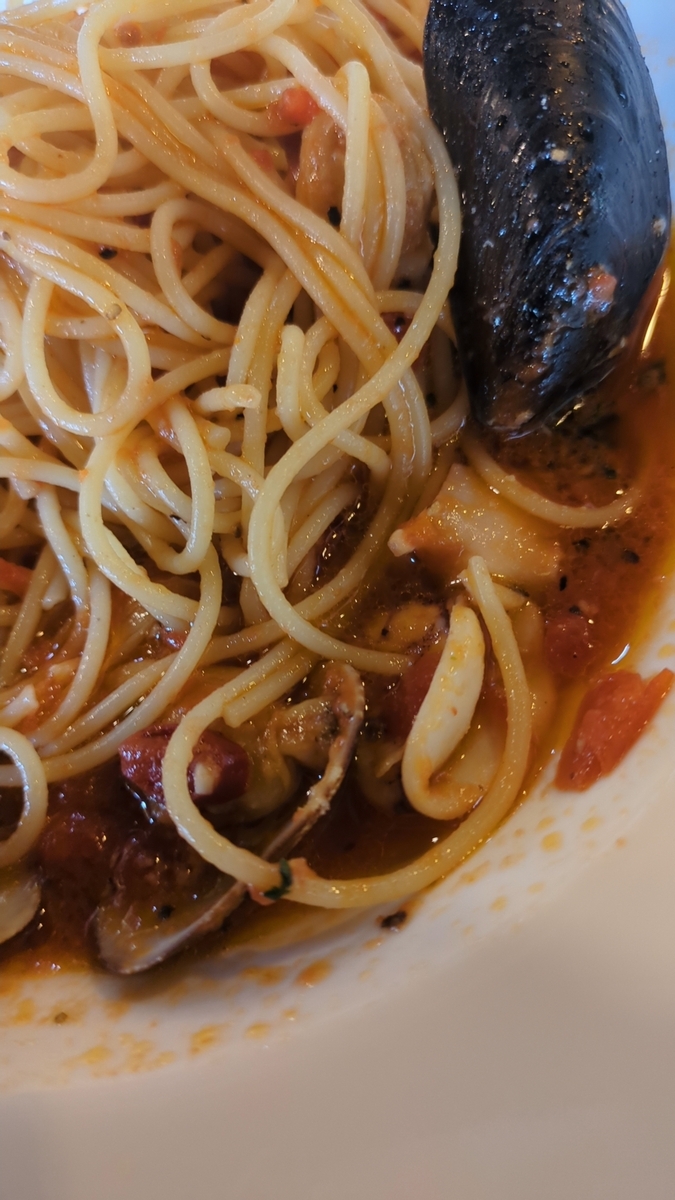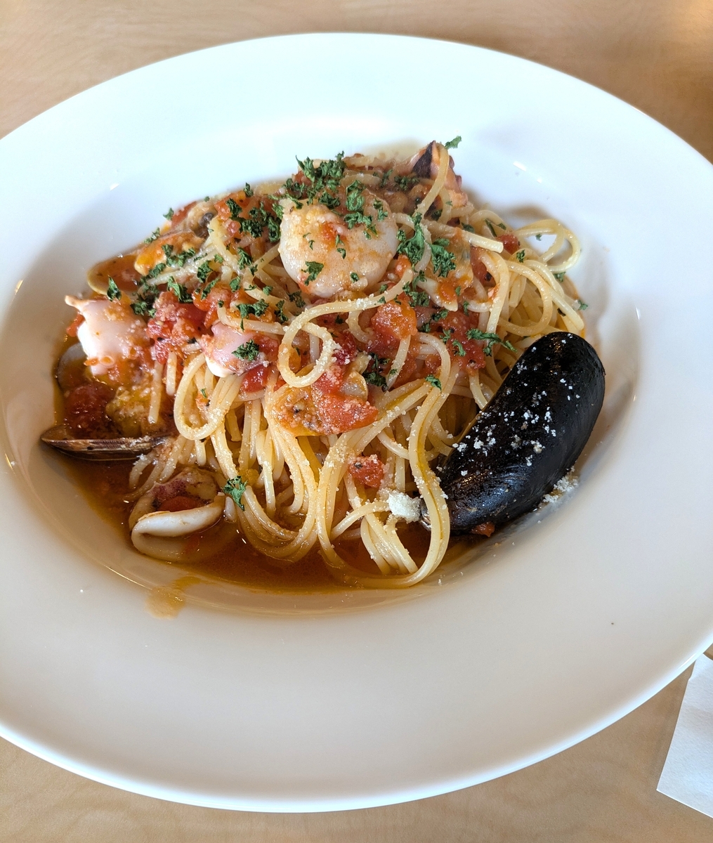 普段海鮮トマトパスタは酸味が強いので多くて食べないんですが、今回のかなりおいしかったです。