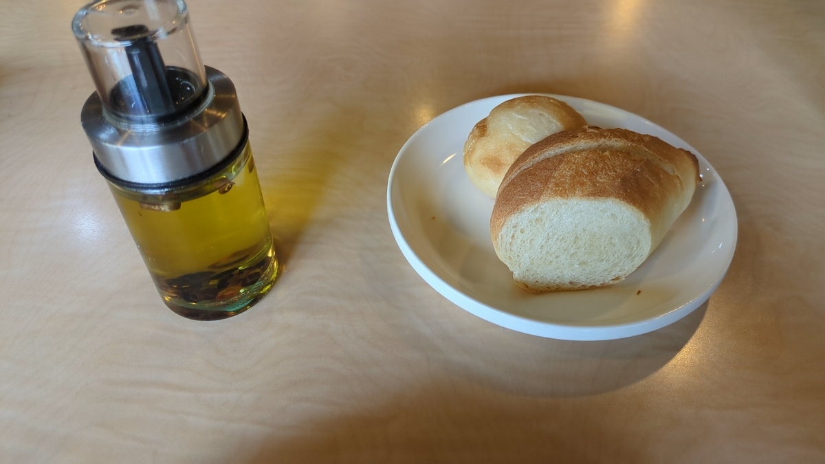 こちらはセットのパン。左は鷹の爪が漬けてあるオリーブオイル。このオイルをかけるかパスタソースをつけて食べますが、このオイル自体は風味が追加されるくらいなので、パスタソースで食べるのがメインでした。