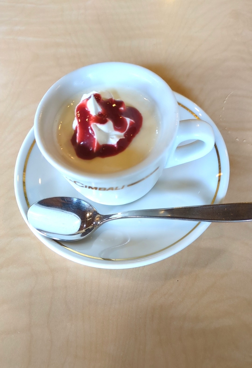 こちらはデザートのパンナコッタ。正直サイズはかなり小さいです。ビジホの飲み放題にある小さいコーヒーカップくらいのサイズです。