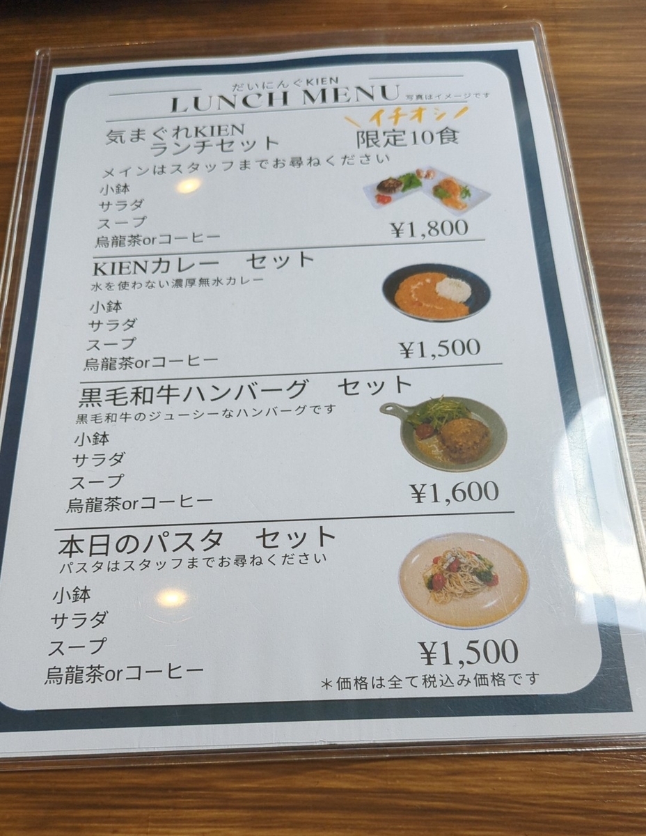 メニューは平日限定10食の気まぐれKIENランチセット。メインに小鉢・サラダ・スープ・ご飯・ドリンクがついて1800円。気まぐれの内容はインスタで確認できます。