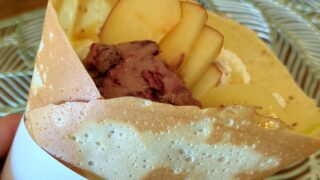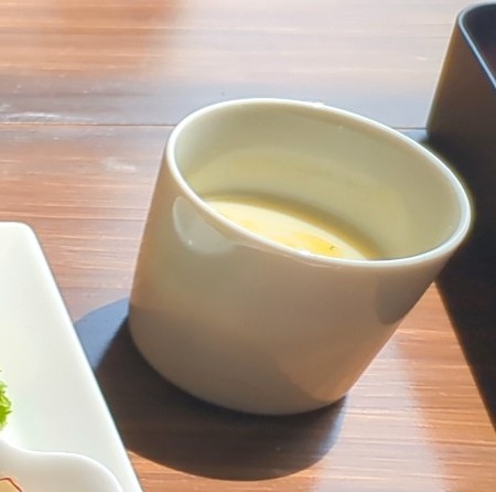 そしてこのポタージュ。飲んだ感じジャガイモかと思ったのですが、それにしてはかなりフルーティーです。複数の素材を入れたポタージュなのでしょうが、新しい味でこれもおいしかったです。じゃがいものポタージュってどうしても舌ざわりのザラザラ感や芋臭さが気になってしまうのですが、これには全くなかったです。