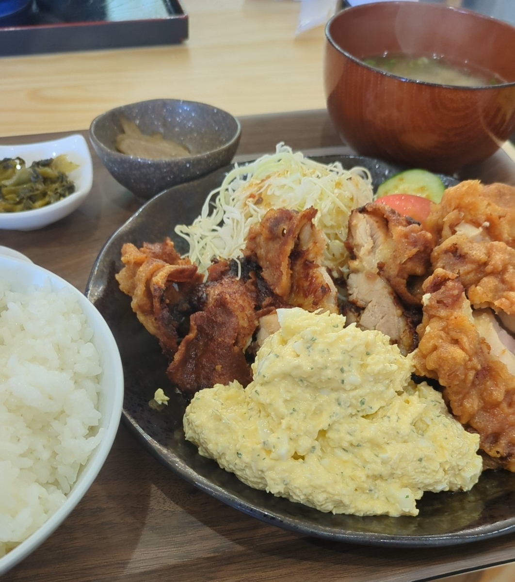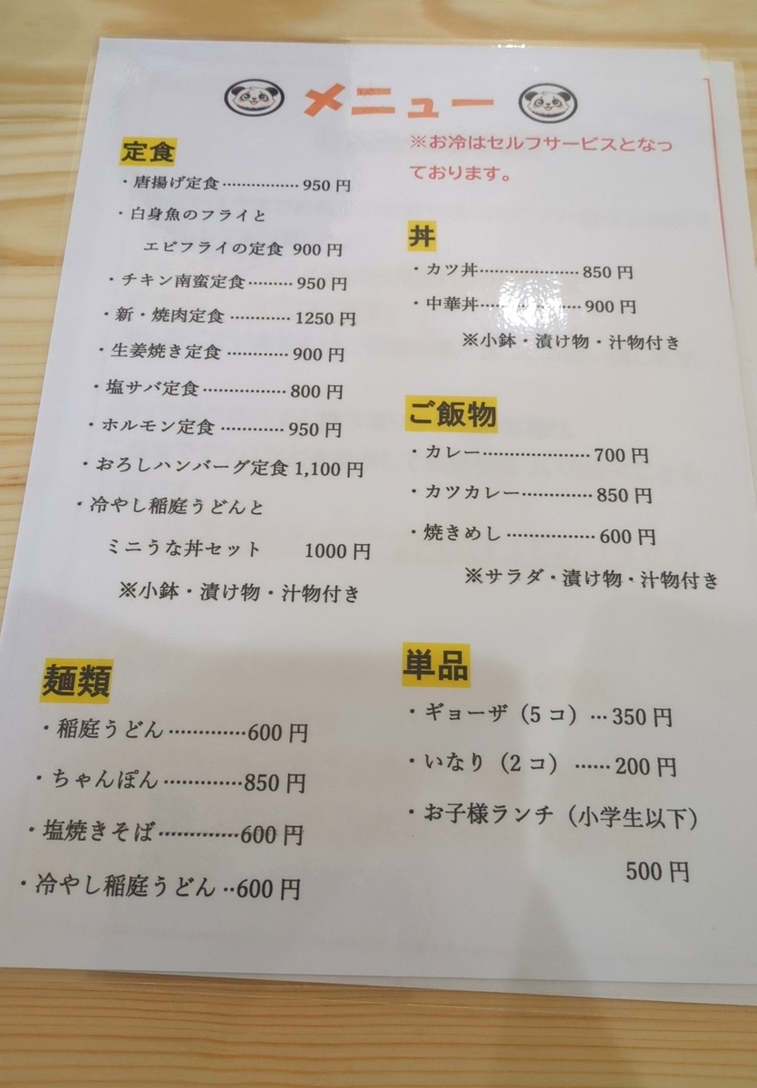 メニューは定食と丼、麺類が中心。定食はからあげやチキン南蛮、ホルモン定食やハンバーグ定食といった肉系メニュー。麺類はちゃんぽんに加え稲庭うどんがあります。