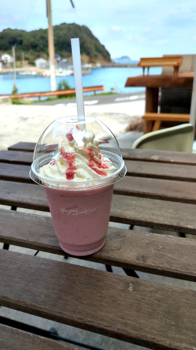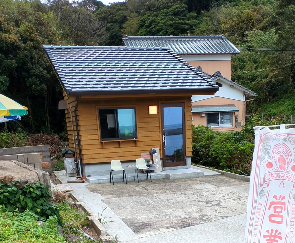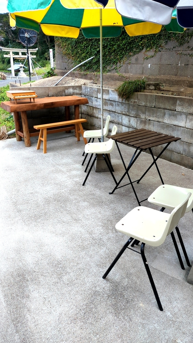 お店は店内にカウンターのイートインスペースと、野外に景色を見ながら楽しめるテーブルスペースが用意されています。目の前は田島神社と漁港があるため、一面の海を見渡すことができます。
