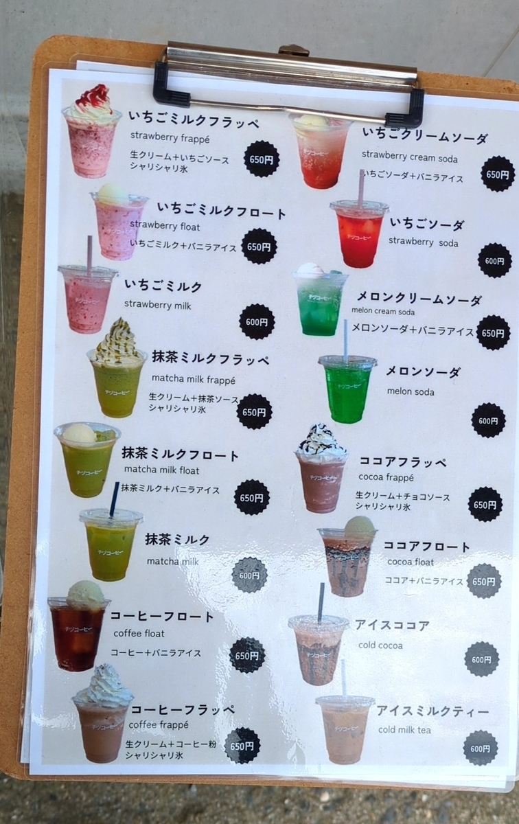 他にも店主の両親がイチゴ農家であり、そこで生産したいちごさんを使ったいちごフラッペやフロート、ソーダが提供され、それ以外にも抹茶、ココア、コーヒーフラッペやフロートが600~650円で提供されます。