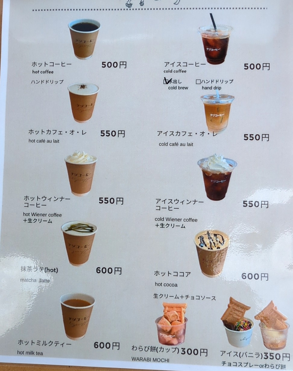 ハンドドリップのコーヒーが500円。そこから抹茶・カフェオレやウインナーコーヒーがあり、食べ物としてわらび餅とアイスがあります。