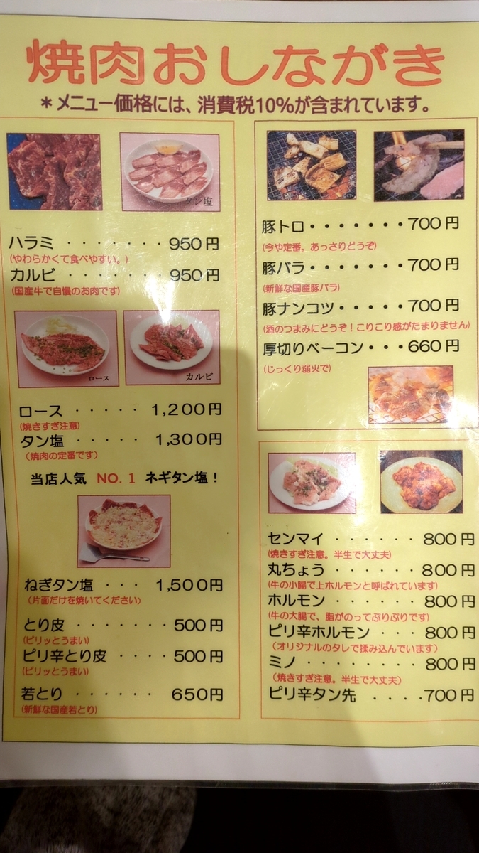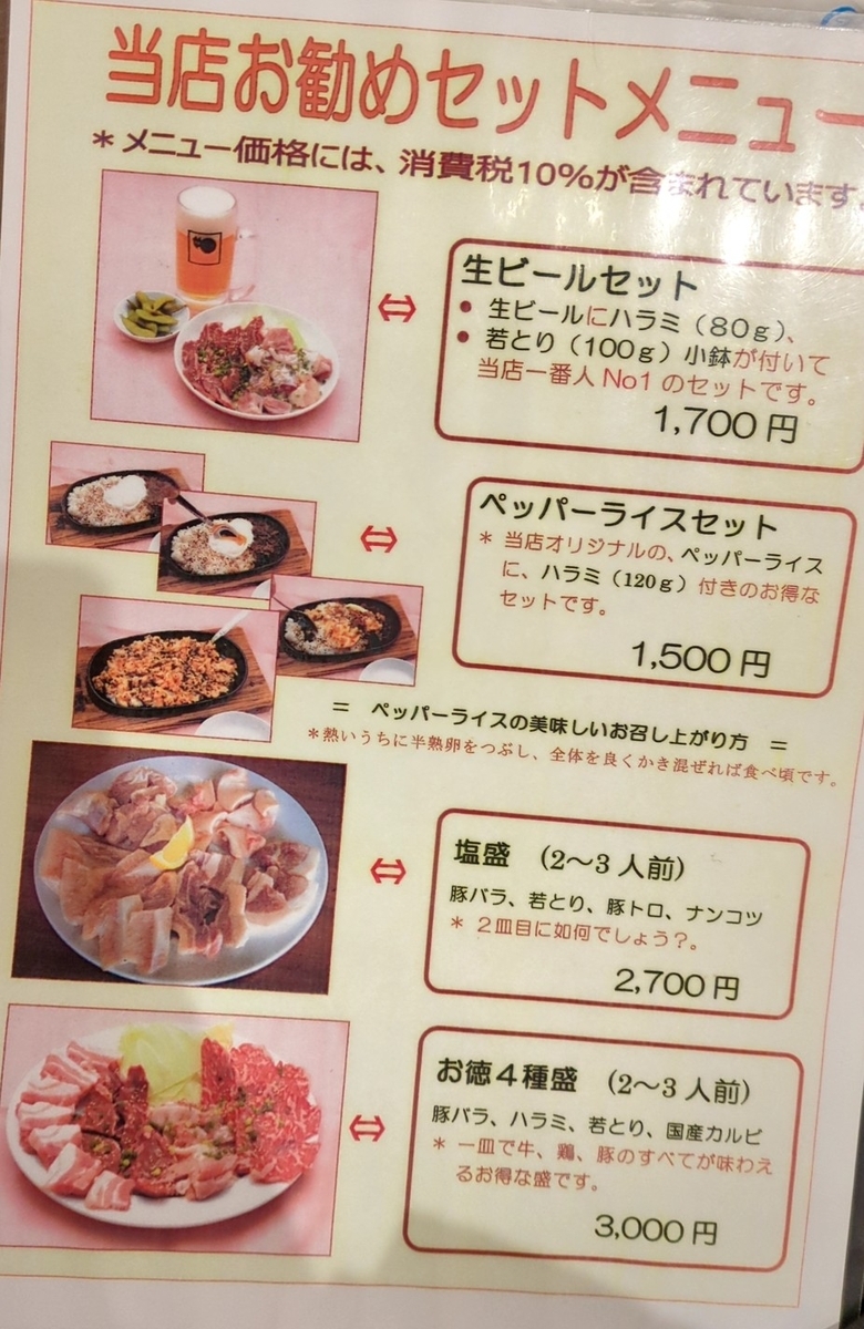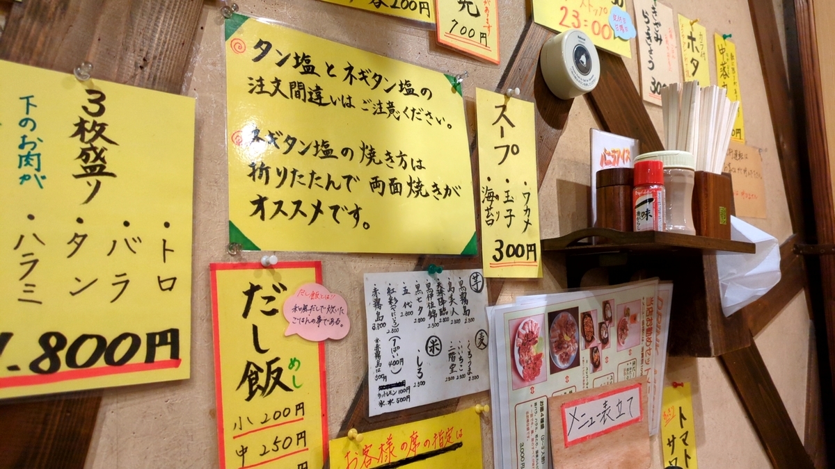 メニューの売りはネギタン塩(1500円)。たっぷりの刻みネギを載せたタンを楽しめる品で、こちらの名物となっています。他にも厚めに切られジャキジャキ食感が売りのピリ辛タン先(700円)。ブラックペッパーを効かせ鉄板でいただくペッパーライス(600円)があります。