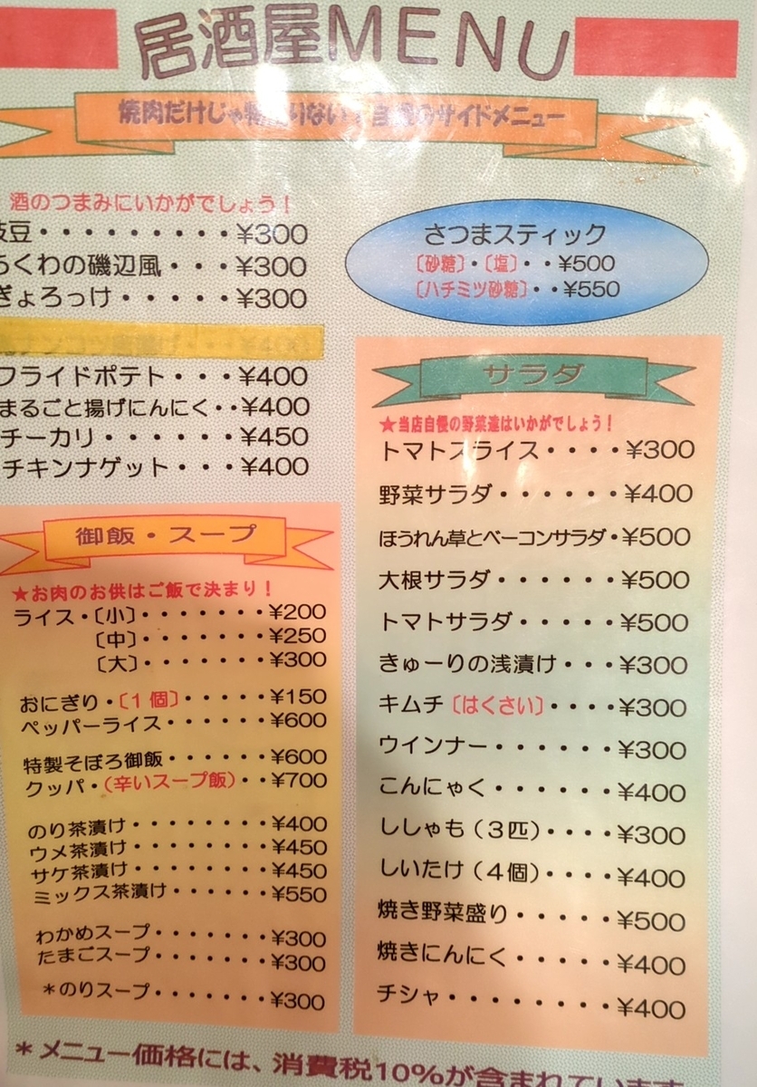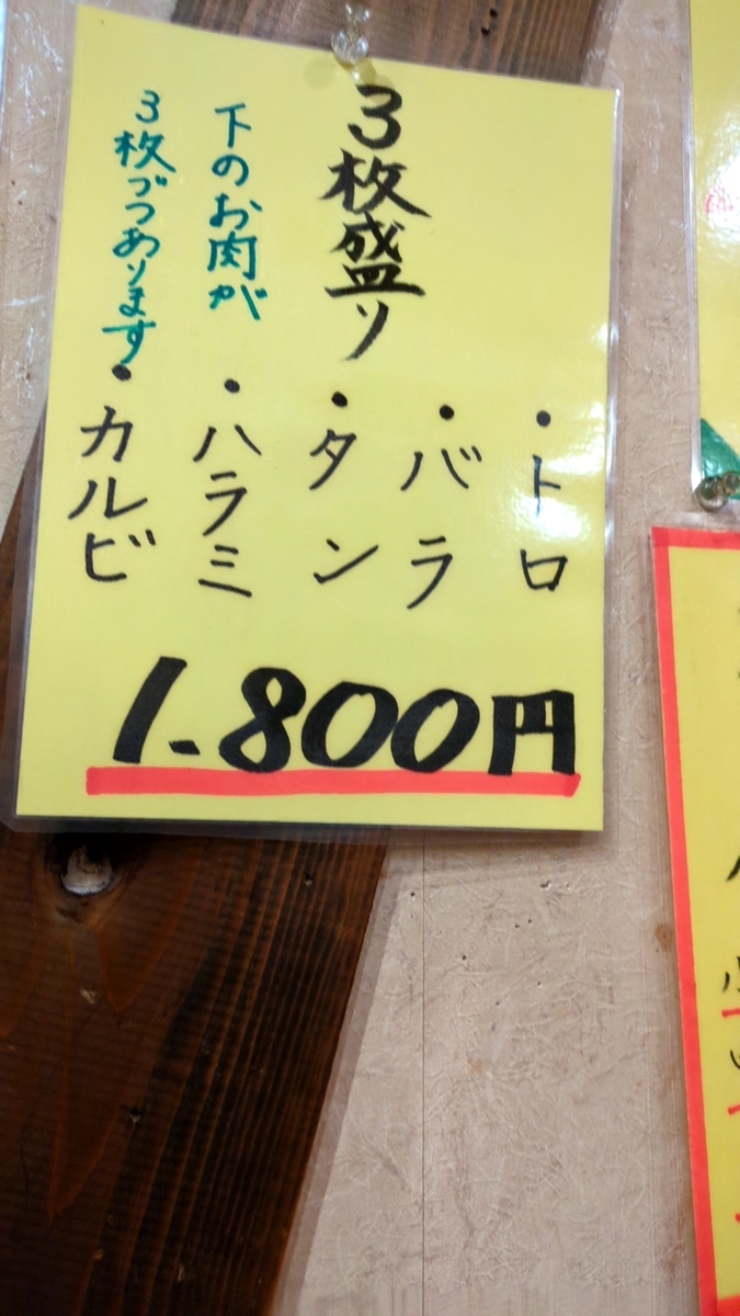 そして気になった壁掛けが3枚盛。5種類の部位が3枚ずつ乗っており、少量を楽しみたい方向けの商品。少人数利用の時とか、とりあえずのときに助かるメニューで、これは楽多屋にはなかったと記憶しています。あちらは団体利用や家族利用が多い店なので、少人数利用が多い楽笑特有のメニューなのかもしれません。