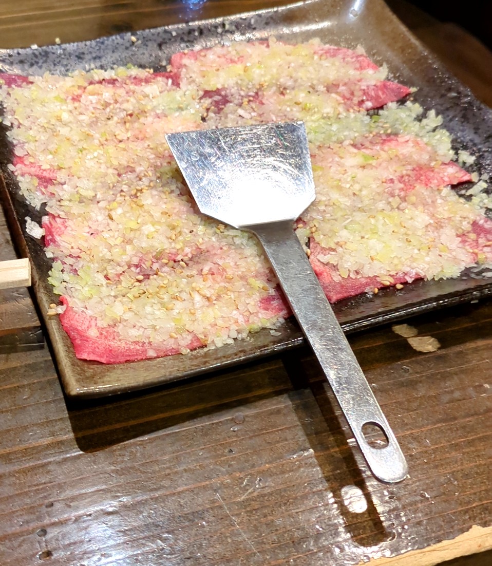 まずは名物のネギタン塩(1500円)。タン塩たちを埋め尽くすような大量の刻みネギが載せられています。もちろん普通に焼くとこぼれるため、折りたたんで片面を半分ずつ焼くようです。